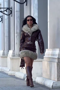 Set tipo piel textura de cocodrilo compuesto por chamarra corta con abotonadura al frente manga larga y falda corta piel vegana. Ambos con pelo en cuello y en falda.