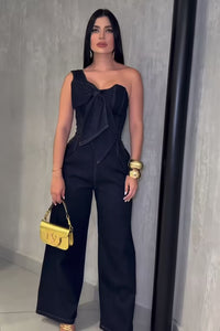 Jumpsuit de mezclilla stretch un tirante ondulado con moño , copa preformada con goma resorte en espalda cierre. Stretch en Cintura.